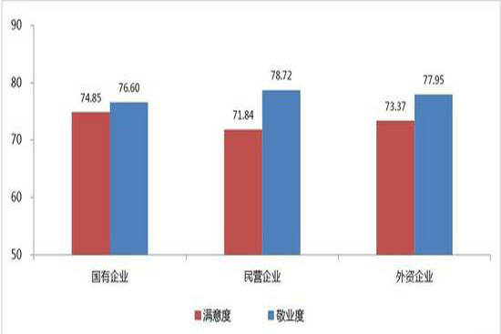 外資企業(yè)員工的滿意度與敬業(yè)度介乎國企與外企之間,同時(shí)發(fā)現(xiàn)國企存在的問題是,其員工滿意度水平較高但敬業(yè)度水平有待改進(jìn)。